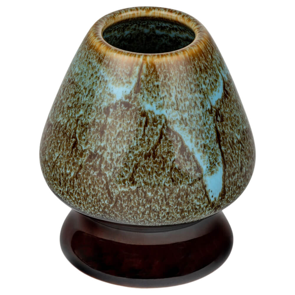 Der Besenhalter (Kusenaoshi) aus glasiertem Porzellan schützt die Form des Chasen, lässt ihn optimal trocknen und verlängert so seine Lebensdauer. Farblich ist er perfekt auf die Schale abgestimmt und ergänzt das Set auf ästhetische Weise.