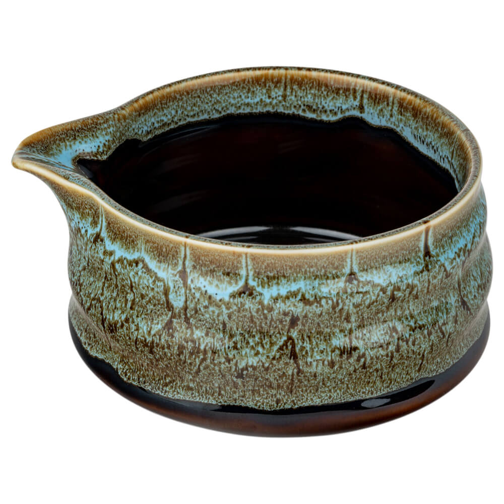 Dieses vierteilige Set von Bredemeijer lädt dazu ein, Matcha neu zu erleben – als sanftes, entschleunigendes Ritual und zugleich als moderne Art, cremigen Matcha Latte zuzubereiten. Die glasierte Porzellanschale in Blau-Braun zieht sofort die Blicke auf sich: Ihre lebendige Glasur erinnert an fließende Naturstrukturen, jede Schale ist ein Unikat. Dank des integrierten Ausgusses eignet sie sich hervorragend, um frisch aufgeschlagenen Matcha sauber und kontrolliert in ein Glas zu gießen – der ideale Begleiter für Matcha-Latte-Liebhaberinnen und -Liebhaber.