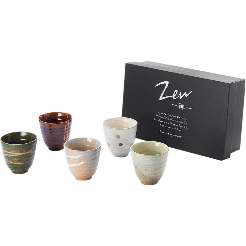 Diese Teebecher aus Japan sind die Grundlage für ein Fest, das sich um den Tee rankt. Sie trinken aus den Bechern nicht einfach Tee, Sie zelebrieren den Genuss - Merken Sie den Unterschied? Und da gleich fünf Becher vorhanden sind, haben Sie auch einen guten Grund, mal wieder Ihre besten Freunde zusammen zu „trommeln“. Dann wird es aber still und meditativ. Diese Teebecher aus Japan haben eine magische Wirkung, die man sich nicht entziehen kann. Sie bestehen aus haltbarer Keramik und sind in einer kongenialen Box verfügbar. Bewundern Sie die schlichten aber markanten Muster – so geht Japan!