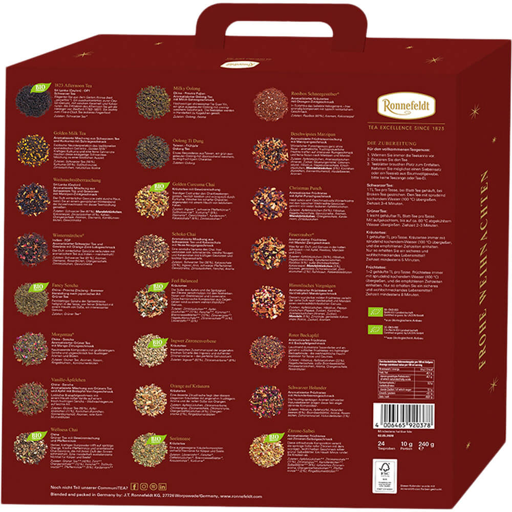 Der Tee Adventskalender peppt die kalte Jahreszeit auf und lädt zu einer täglichen Auszeit ein. Jeder Tag im Dezember bringt nicht nur die Vorfreude auf Weihnachten, sondern auch die Spannung, welche köstliche Teesorte sich hinter dem nächsten Türchen verbirgt. Erleben Sie die besondere Freude, sich mit wohltuenden Aromen und ausgewählten Tees zu umgeben – eine erfrischende Alternative zu herkömmlichen Schokoladen-Adventskalendern!